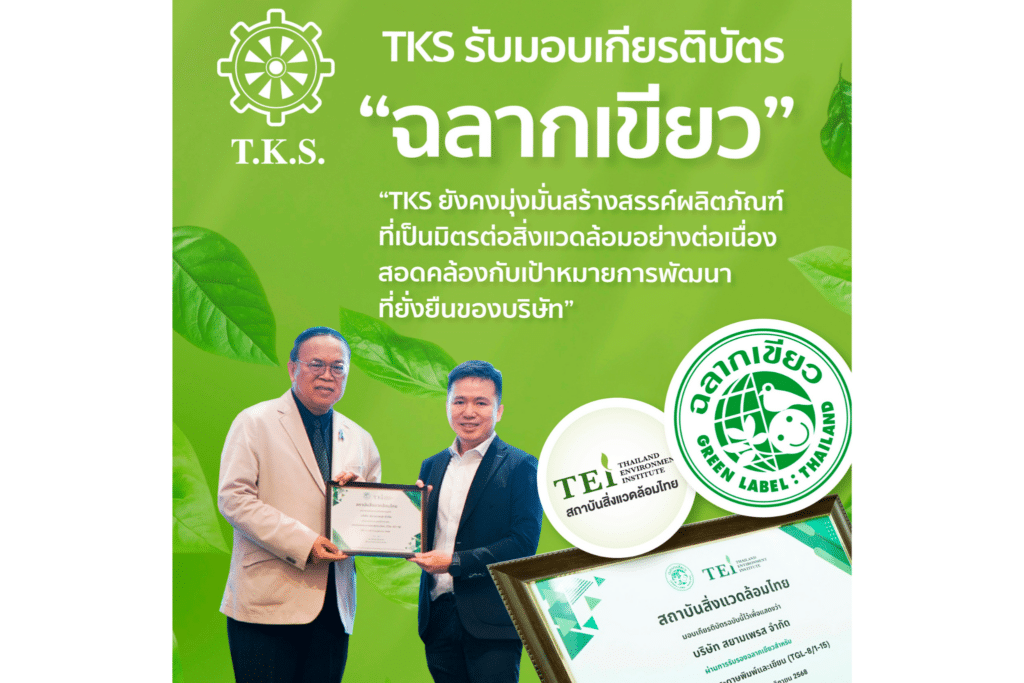 บริษัท สยามเพรส จำกัด ในเครือ บริษัท ที.เค.เอส.เทคโนโลยี จำกัด (มหาชน) หรือ TKS ผู้ประกอบธุรกิจ Security Printing ครบวงจรรายใหญ่ของประเทศ เข้ารับมอบเกียรติบัตรสำหรับผู้ได้รับการรับรอง ฉลากเขียว ประจำปี 2567–2568